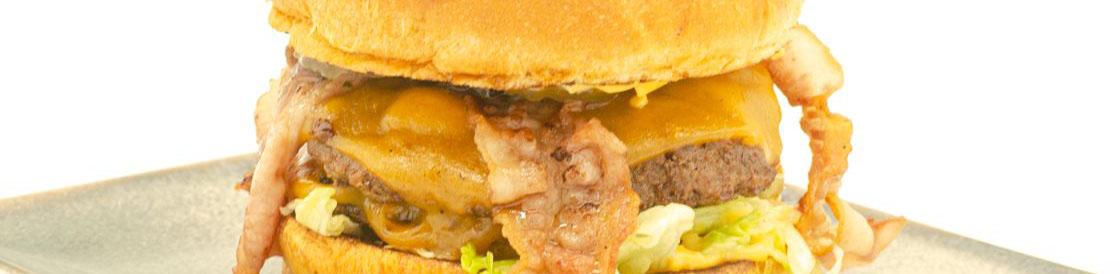 buci, hamburgerszósz, 2db 100% marhahúspogácsa (130g), dupla cheddar sajt, bacon, csemegeuborka, lila hagymalekvár