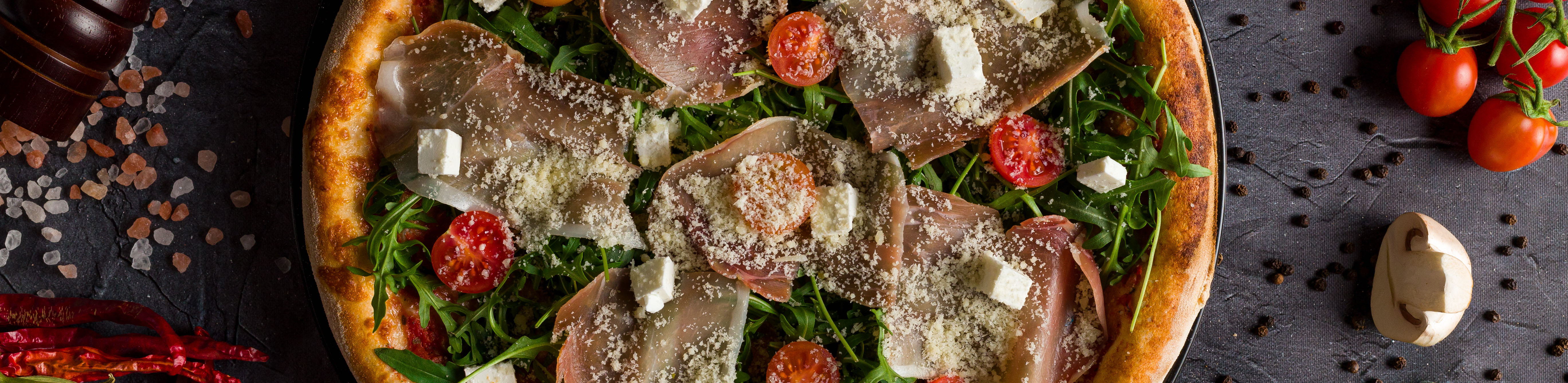 Paradicsomszósz, füstölt mozzarella, rukkola, serrano sonka, feta sajt, szalámi, koktélparadicsom, parmezan